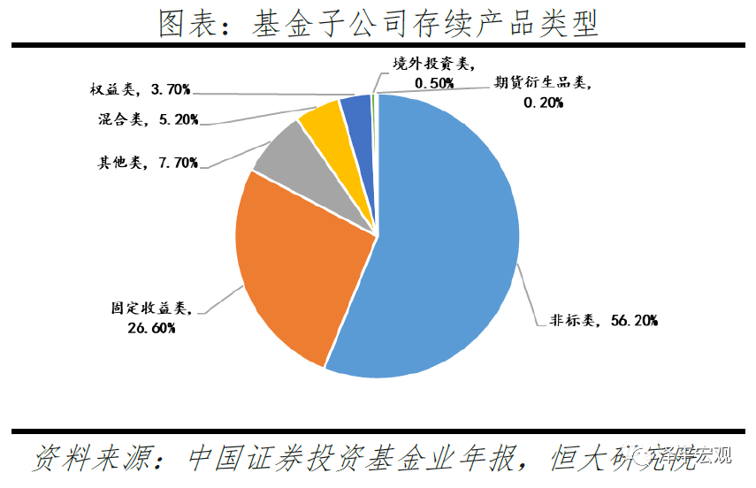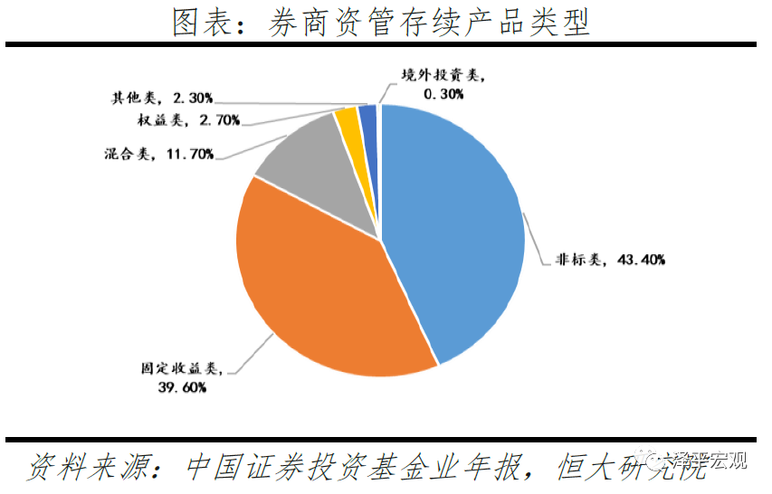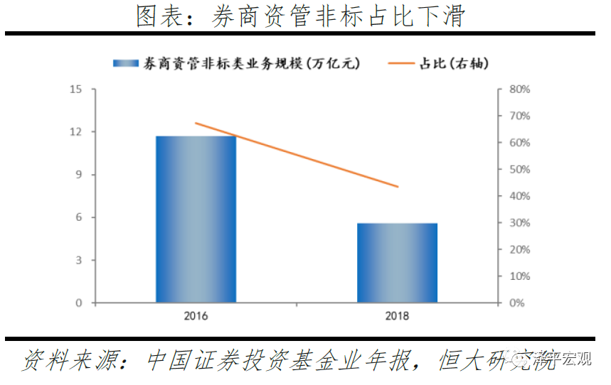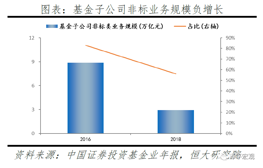 从非标业务来看,基金子公司和券商资管非标业务规模和占比均出现大幅下滑。2018年末,基金子公司非标类业务规模达2.95万亿元,而2016年末高达8.87万亿元,规模萎缩近七成,占比则从82.8%下滑至56.2%。2018年末,券商资管非标类业务规模达5.6万亿元,而2016年末高达11.7万亿元,规模萎缩超五成,占比从67.4%下滑至43.4%。除非标产品外,基金子公司和券商资管其他主要存续产品主要投向公开市场发行的债券,即固定收益类。
