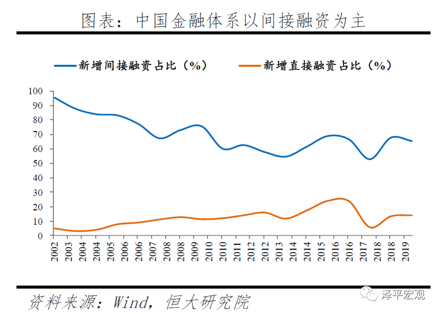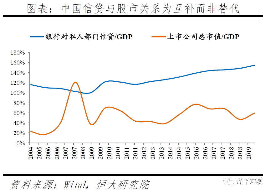 我国现行金融体系为间接融资主导,银行信贷地位不断强化,直接融资地位尚未巩固。从相对地位看,存量法下,2019年中国间接融资占比超过60%,处于主导地位。增量法下,直接融资比重曾在2016年达24%,但伴随近年去杠杆、发债违约潮,2017年直接融资增量占比一度下降到6%,可见直接融资地位尚不稳固。从绝对量来看,两种融资体系均呈上升态势,2004-2019年,银行对私人部门信贷占GDP比重从117%升至155%,股票市值占GDP比重从23%升至60%。整体来看,当前中国仍以间接融资为主,直接融资尚不能替代间接融资体系。