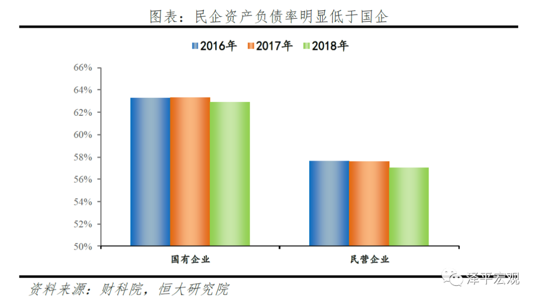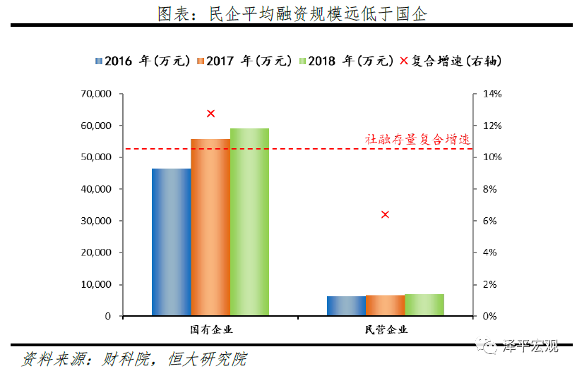 国企融资资源明显优于民企,民营企业平均融资规模仅为国企12%,增速低于国企6个百分点。从规模看,2016年-2018年,国有企业平均融资规模分别为4.6亿元/家、5.6亿元/家和5.9亿元/家,民营企业平均融资规模分为6179万元/家、6583万元/家和6997万元/家。民企平均融资规模远低于国企,2018年仅为国企的12%。从增速看,2016-2018年,民企、国企平均融资规模复合增速为6.4%、12.8%,民企低于国企6.3个百分点,低于同期存量社融复合增速5.4个百分点。2017年金融严监管并没有冲击国有企业,国有企业平均融资规模增速高达20%。从负债率看,国有企业资产负债率明显超过民营企业,2018年高于民企6个百分点。