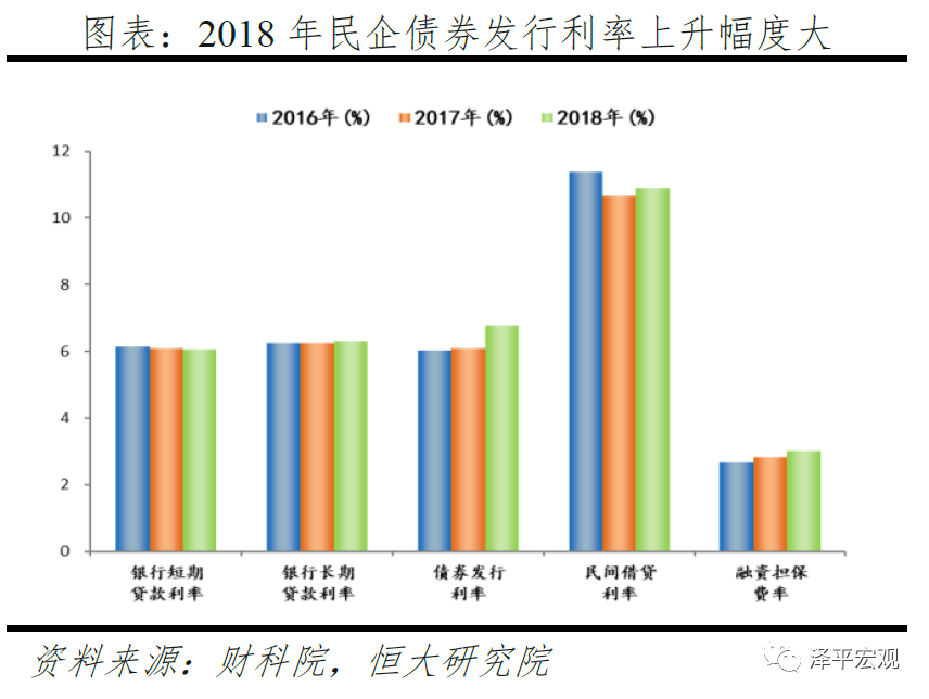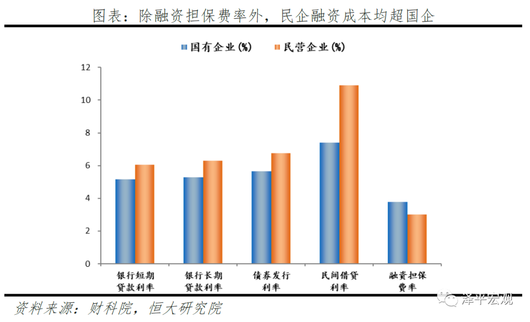 除融资担保费率外,民营企业各项融资成本均明显超国有企业。其中民间借贷利差更是超过300BP。2018年国有企业短期贷款利率、长期贷款利率、债券发行利率、民间借贷利率和融资担保费率分别为5.17%、5.28%、5.66%、7.41%和3.79%,同期民营企业分别为6.05%、6.31%、6.77%、10.9%和3.01%。其中民营企业短期贷款、长期贷款、债券发行、民间借贷利率分别比国有企业高了88BP、103BP、111BP和349BP,仅融资担保成本民企略低于国企。其中民间借贷利差的高企不仅反映了民营企业的信用溢价,而且反映了民营企业的银行信贷和债券融资的可及性较差,使其不得不转向民间借贷,推升了民间借贷利率。