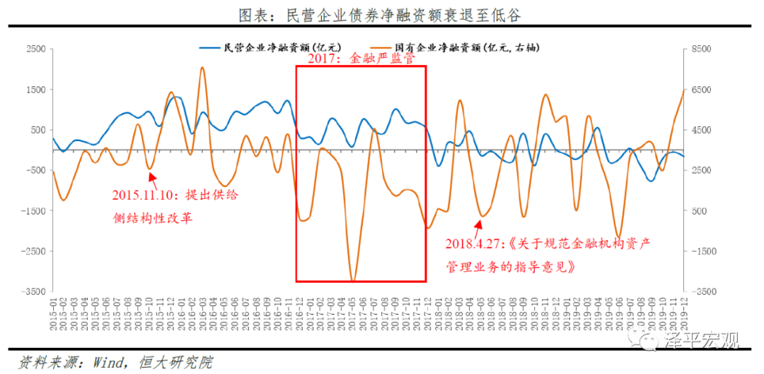 对非标业务的分析进一步佐证了上述“通道业务收缩-民营企业信用承压”的逻辑:《证券法》中公开发行公司债的门槛过高,有净资产和利润规模等限制,使民营企业难以公开发行公司债,不得不依赖于非标进行债权融资。资管新规后,基金子公司和券商资管非标规模均出现大幅萎缩,民营企业融资渠道阻塞,信贷市场所有制歧视加剧。