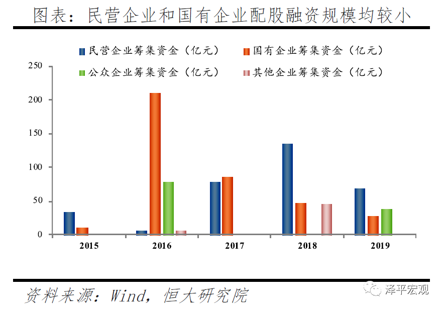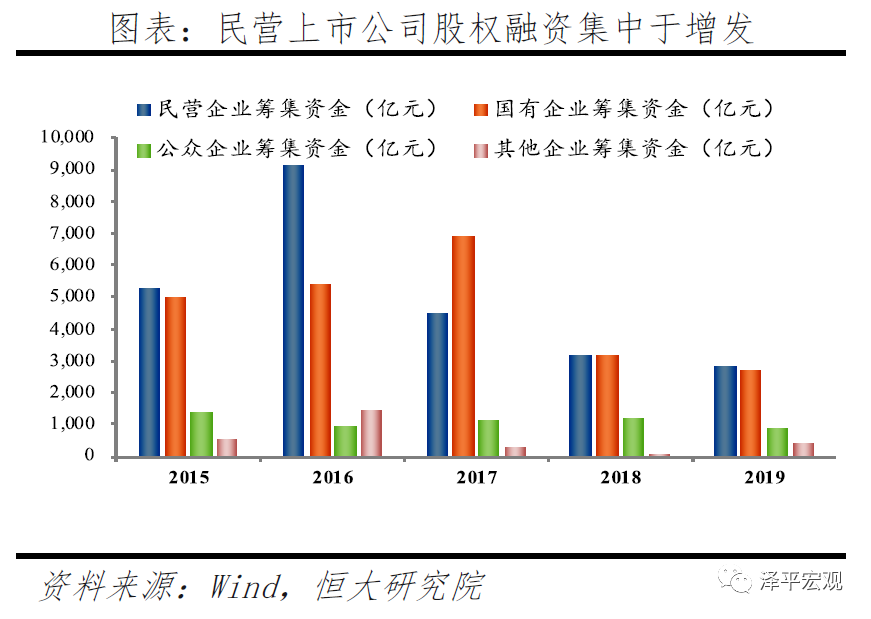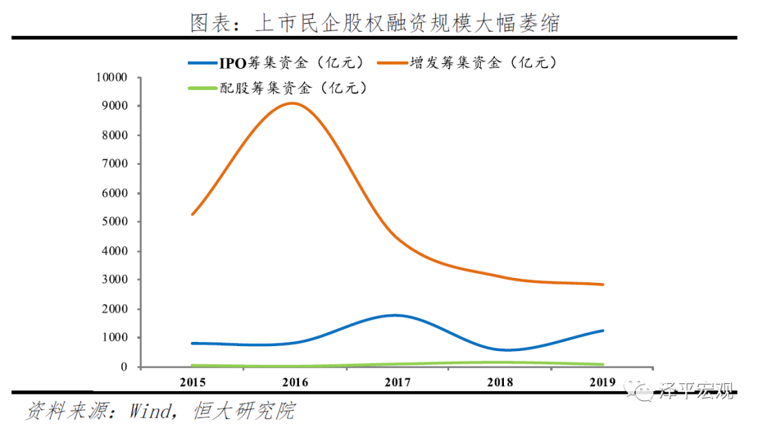 从总量上看,2019年A股股权融资规模达9465亿元,其中44%流向民企,36%流向国企,民企略胜一筹但总规模较小。股权融资方面,上市公司主要通过新股IPO、增发和配股三种方式进行融资。2015-2019年,全市场股权融资(含新股IPO、增发和配股)规模分别为1.4、1.9、1.5、0.91和0.95万亿元。其中,2015-2019年国有企业的股权融资规模分别为5574亿、5849亿、7353亿、3445亿和3451亿,占比为40.3%、31.4%、48.5%、37.7%和36.5%;同期民营企业股权融资规模分别为6096亿、9931亿、6292亿、3834亿和4159亿,占比分别为44.1%、53.4%、41.5%、42.0%和43.9%。民营企业股权融资略多于国有企业,但总体规模偏小,难以填补所有制歧视带来的信贷、债券融资缺位。2017年金融严监管对民营企业股权融资有一定冲击,较前一年融资规模下滑了36.6%,之后国企和民企股权融资规模均有大幅萎缩。