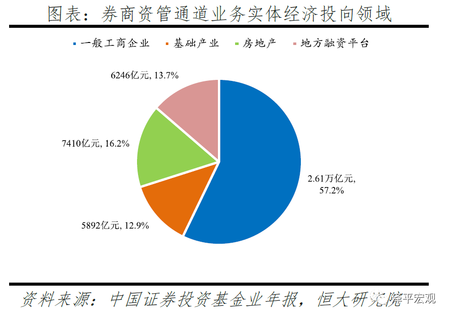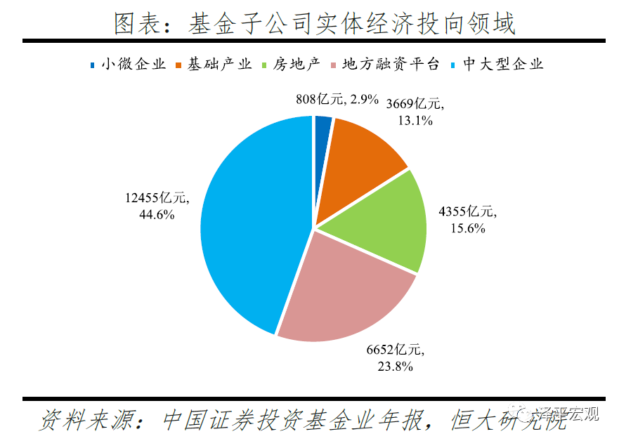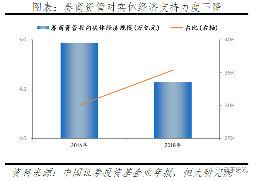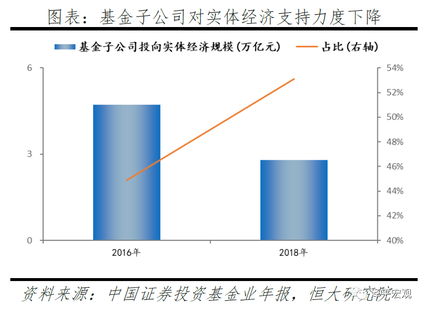 从实际投向来看,基金子公司和券商资管对实体经济支持力度下降,其中基金子公司投向实体经济资金中近五成流向中大型企业。2018年末基金子公司投向实体经济规模为2.79亿元,占比53.1%,而2016年末基金子公司投向实体经济规模达4.72亿元,占比44.9%。2018年末券商资管投向实体经济规模为4.57亿元,占比35.4%,而2016年末基金子公司投向实体经济规模达4.97亿元,占比30.1%。值得注意的是,根据基金子公司披露的实体经济投向领域,2018年有1.25万亿元资金投向了中大型企业,占比达44.6%,而投向小微企业的资金仅有808亿元,占比仅为2.9%。小微企业是民营企业的重要组成部门,基金子公司投向小微企业规模小、占比低为民营企业融资难贵提供了间接证据。