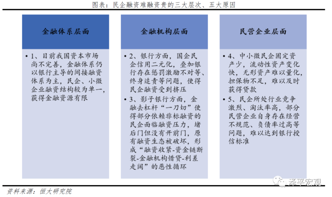 民企融资难贵,根源在于三大层次五大原因。金融体系层面,一是我国以银行主导的间接融资体系为主,民企获得的金融资源有限。金融机构层面,二是监管、制度、风险收益等因素导致银行偏好国企,民企融资受到挤压;三是2017年以来金融去杠杆“一刀切”,部分依赖非标融资的民企融资压力加剧。民企经营层面,四是中小微民企资产规模偏小、缺乏抵质押物;五是部分民营企业自身存在经营不规范、负债率过高等问题,难以达到银行授信标准。