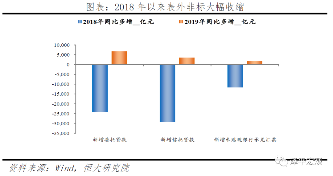 2017年以来的金融严监管以“一刀切”方式执行,信托、委托贷款等民企依赖的非标融资渠道受阻,不少民企面临流动性压力,形成了“融资收紧-资金链断裂-金融机构惜贷-利差走阔”的恶性循环。为防范化解重大金融风险,2017年监管当局加强对影子银行监管,打破刚兑,严禁资金池与期限错配,委外业务大幅萎缩,2018年新增信托贷款、委托贷款和银行未承兑汇票分别萎缩至-0.7、-1.6和-0.6万亿元。民企融资中的其他融资来源大幅减少,银行信贷在经济下行压力加大的背景下增长较慢,民企和小微企业原有融资生态被破坏。