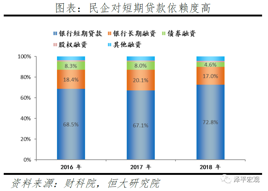 从分项占比看,国有企业的短期、长期和债券融资结构相对均衡,民营企业对短期贷款的依赖度较高。2018年国有企业短期贷款、长期贷款和债券融资占比分别为29.7%、41.1%和15.5%,其中2016-2018年间中长期贷款占比提升了1.3个百分点。民营企业对短期贷款依赖度较高,2018年占比达72.8%,而长期贷款、债券融资占比分别为17.0%和4.6%,其中2016-2018年间长期贷款占比下滑了1.5个百分点,债券融资占比也萎缩了3.6个百分点。此外债券融资占国有企业总融资额的比例超过15%,而民营企业债券融资占比低于5%。