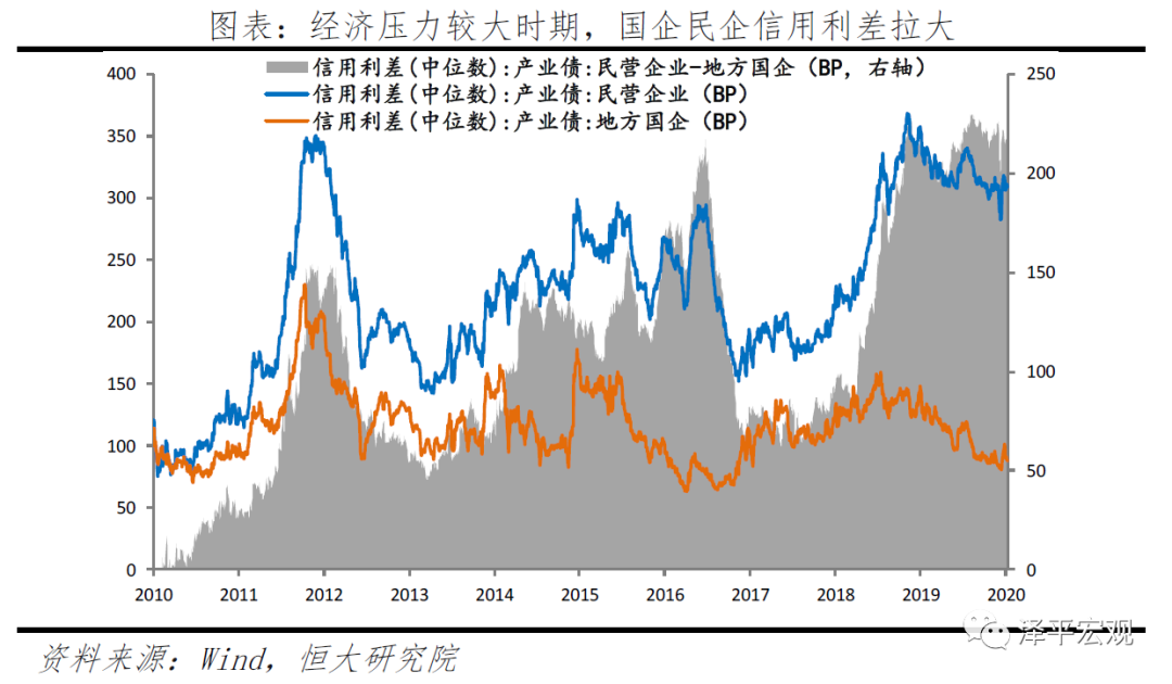 商业银行需满足监管当局对不良率、银行资本金、流动性等指标考核,因此主要考虑资产质量及风险收益,信用二元化导致商业银行天然偏好国企。一方面,当前我国国企运营仍存在政企难分问题,在实际融资过程中,因存在政府隐性担保,叠加国企企业规模通常较大、抵押品充足,国企在金融资源可得性上存在天然优势。另一方面,在经济下行期商业银行为确保资金安全,普遍存在“惜贷”心理,在收缩信贷额度的同时争抢信用等级较高的国企贷款需求。即使银行愿意对民企放贷,也需经过繁杂的手续、严苛的抵押。以上因素共同导致国企民企融资环境分化、民企融资难贵问题的爆发。历史上2012、2015、2018年经济下行压力较大时期,国企民企信用利差均明显拉大。