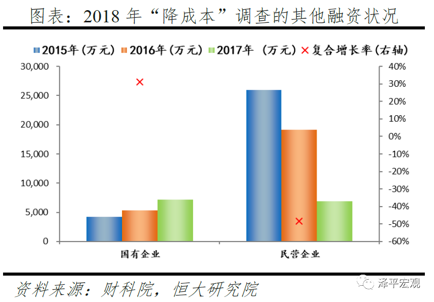 从2018年调查结果来看,民企对非标融资的依赖度高,但金融严监管以来非标规模、占比快速萎缩。国企对非标融资依赖度低,且受冲击相对小。2018年“降成本”调查中,从规模来看,2015-2017年,国有企业其他融资平均规模分别为4190万元/家、5334万元/家、7190万元/家,民营企业分别为25997万元/家、19187万元/家、6913万元/家,民企其他融资规模最高为国企的6倍。从增速来看,2015-2017年,国企、民企其他融资平均规模复合增长率分别为31%、-48%,金融严监管下,民企非标融资规模大幅萎缩,国企受冲击较小。从占比来看,2015-2017年,国企其他融资占比分别为6%、5%、3%,民企分别为43%、37%、15%,国企非标融资占比基本稳定,民企大幅萎缩。