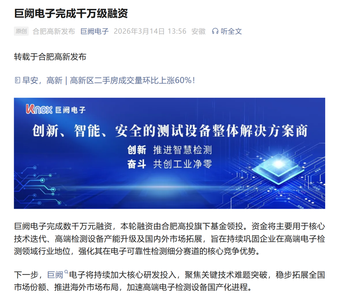 本轮融资将主要用于核心技术迭代、高端检测设备产能升级及国内外市场拓展,旨在持续巩固企业在高端电子检测领域行业地位,强化其在电子可靠性检测细分赛道的核心竞争优势。