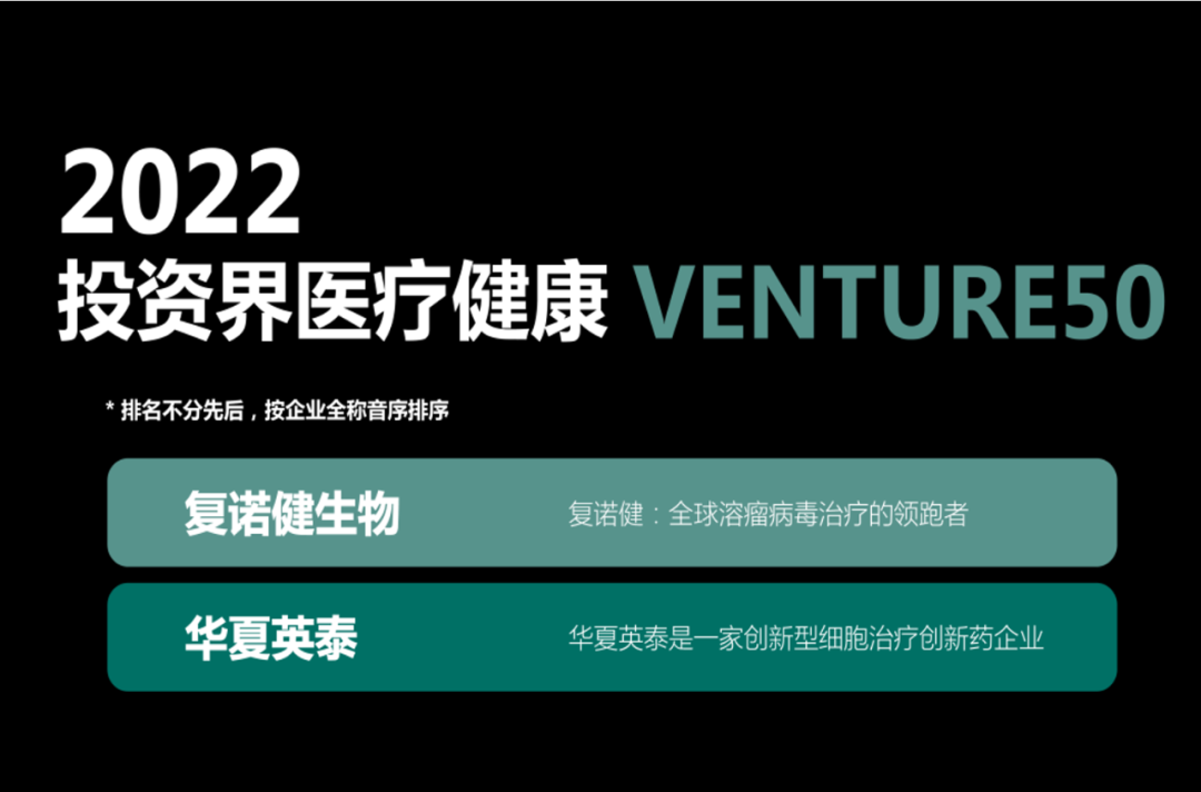 本次评选中,仙瞳资本投资企业复诺健生物、华夏英泰荣登2022年度Venture50榜单,榜单如下: