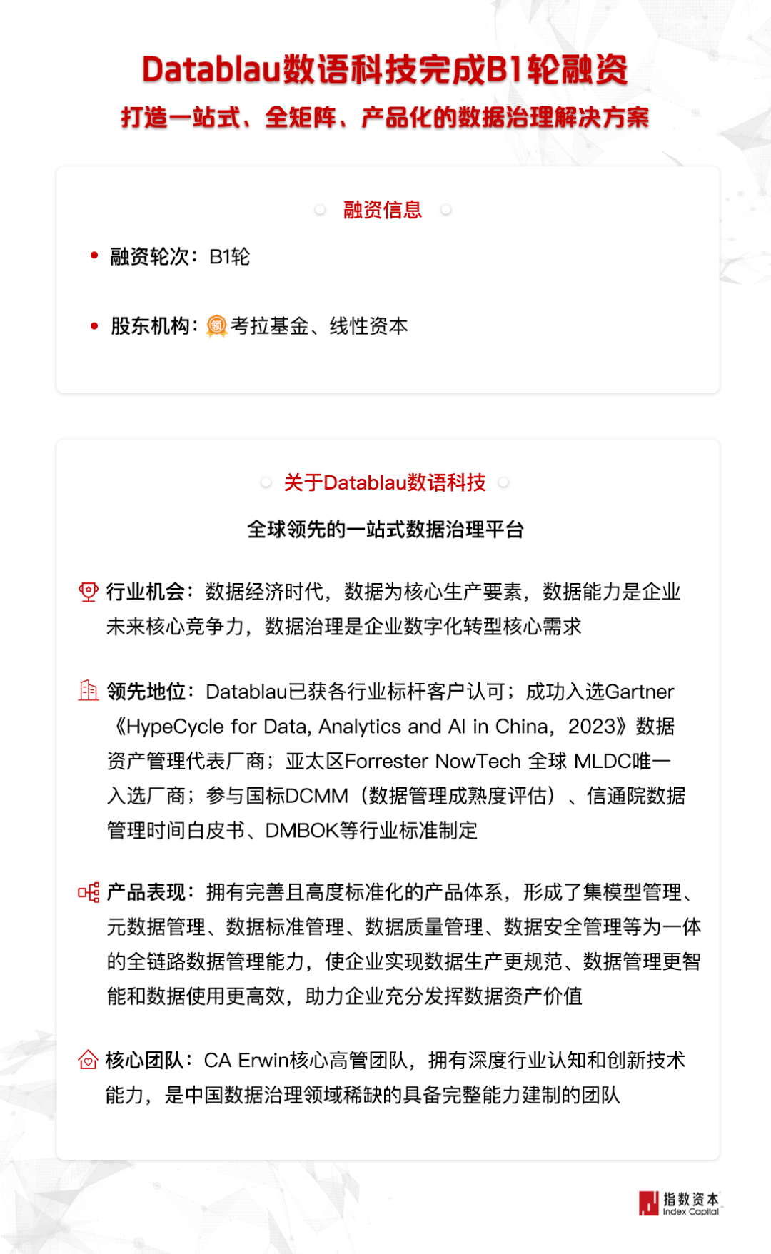 Datablau创始人兼CEO王琤表示,指数资本的专业能力和责任意识非常打动我们。在市场环境整体低迷的情况下,依然帮助公司顺利完成融资,引入重要的股东机构。同时,在融资之外,指数资本也积极与我们分享产业洞察、发展战略等方面的思考与建议,为公司的长线发展提供了有增量价值的帮助。期待未来,在指数资本和众多股东机构的助力下,Datablau能够在“数据治理赋能企业数字化转型”的道路上砥砺前行,帮助企业通过数据治理实现高质量数据资产管理产品及服务,持续驱动全社会数字化转型的发展与进步。