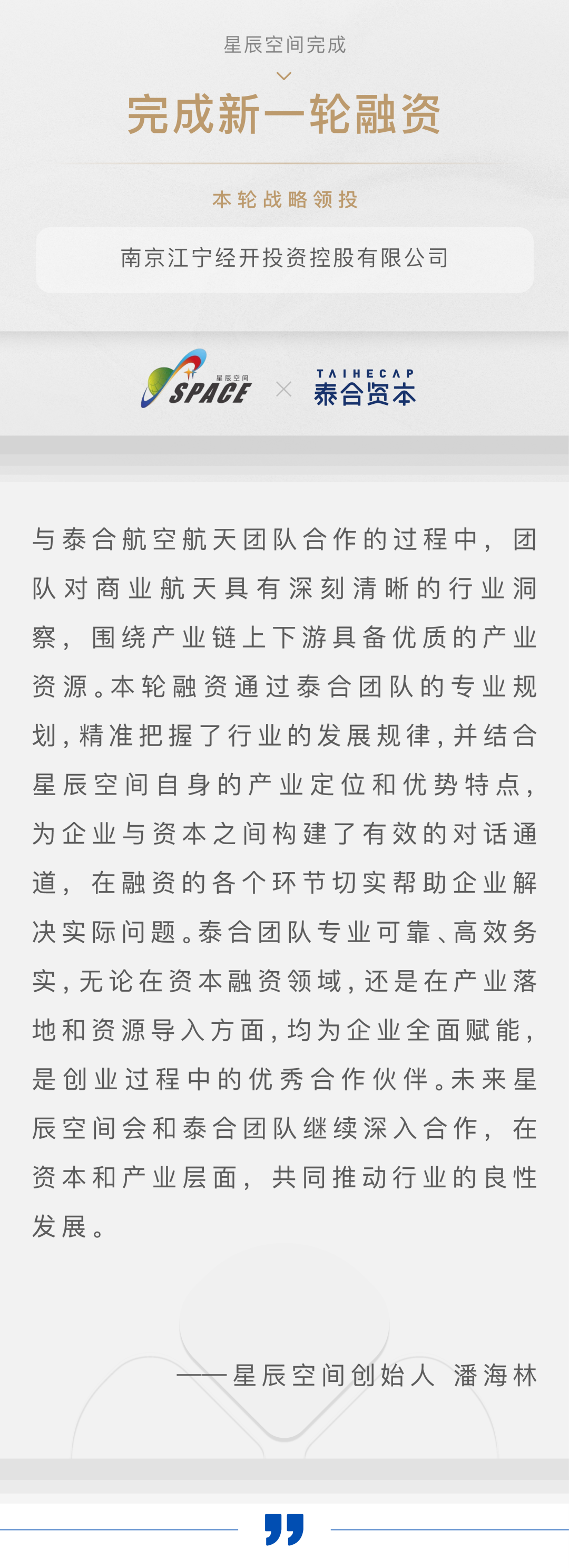 泰合资本副总裁杜瑞表示:星辰空间在潘总的带领下,深耕行业、专注产品、低调务实,通过过硬的技术实力和优秀的产品表现,成为当下几大卫星互联网星座的核心民营供应商。星辰空间对高质量的极致追求,不仅满足中国航天发展的根本需要,也是公司获得良好客户口碑的本质保障。空间推进器作为整星平台最具价值的核心引擎,其技术研发的高难度和供货资质的高门槛,使该行业成为稀缺的技术供给驱动产业,为星辰空间拓展更广阔的市场空间提供充分的壁垒保护和时间先机。我们期待和星辰空间继续探索更多的商业可能性,为企业在资本融资、客户合作、产业落地方面全方位赋能。