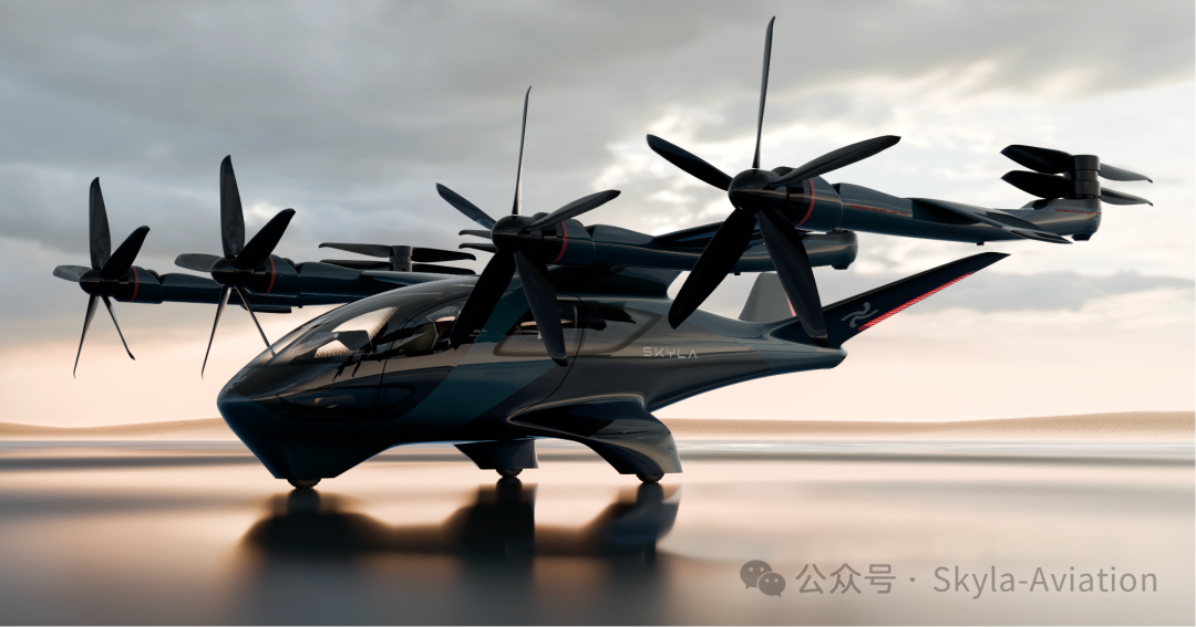 旗下核心 eVTOL 产品 Skyla V30是严格遵循 “商用航空级别安全标准” 并采用 “开放式架构” 的6座2吨级智能eVTOL飞行器,是聚焦低空城际载客出行的新一代全电驱动垂直起降公务机,产品场景定位清晰,以 “隔山隔海” 的城际出行场景为切入,采用倾转旋翼技术路线,核心团队来自中航工业、中国商飞、昂际航电、柯林斯宇航、阿里巴巴等,团队拥有军用飞机、商用飞机、旋翼机、公务机、eVTOL等多机型研发、制造、运维完整的取证经验。