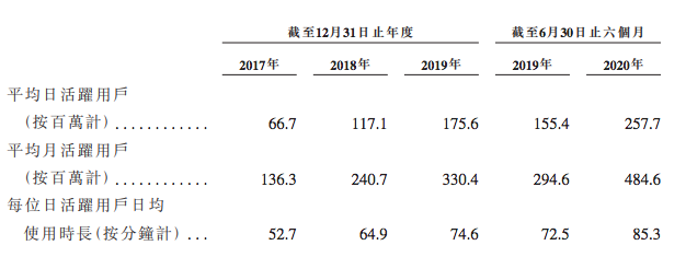 截至2020年6月30日,快手应用程序及小程序平均日活跃用户达3.02亿,月活跃用户达7.76亿。同一期间内,日活跃用户在快手的日均使用时长超过85分钟、日均访问快手应用超过10次;快手短视频、直播点赞、转发及评论超过1.63万亿条。