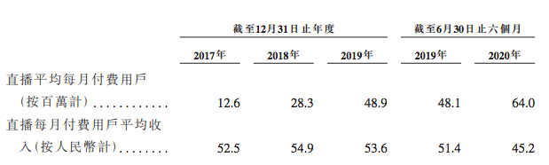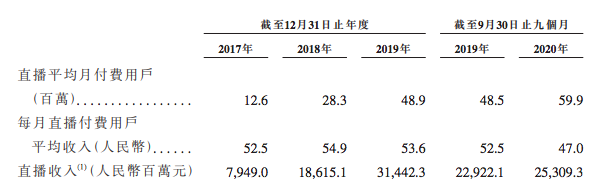 快手直播每月付费用户平均收入,2017-2019年分别是52.5、54.9、53.6元,2020上半年45.2元,2020前九个月是47元。