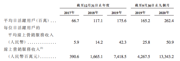 快手应用的每个DAU贡献的平均线上营销服务收入,由2017年的6元增至2018年的14元,再进一步增至2019年的42元。按半年计,快手每个DAU的平均线上营销服务收入由2019上半年的14元增至2020上半年的28元;2020前三个季度对应数字是50.9元。