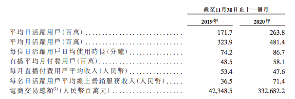快手平台促成的电商交易总额由2018年的9660万元增至2019年的596亿元,并由2019前11个月的423.49亿元增至2020前11个月的3326.82亿元。