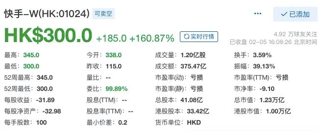 快手发行价115港元/股,今日收盘报300港元/股,涨幅160.87%。