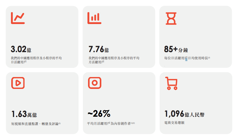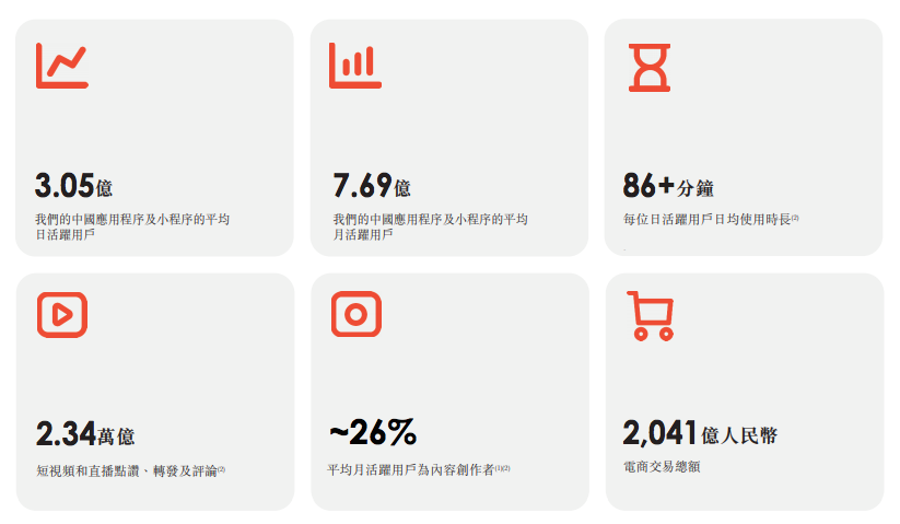 截至2020年9月30日,快手应用程序及小程序平均日活跃用户达3.05亿,月活跃用户达7.69亿。同一期间内,日活跃用户在快手的日均使用时长超过86分钟;快手短视频、直播点赞、转发及评论超过2.34万亿条。