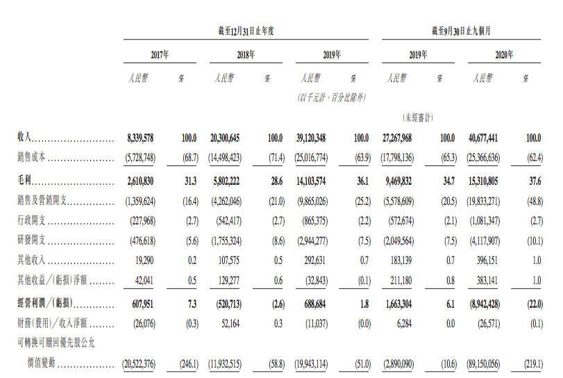 快手此前递交的招股书显示,2017-2019年,快手的收入从83亿上升至203亿与391亿元人民币;截至2020年6月30日的上半年,实现收入253亿元;2020前三季度收入406.77亿元(本文如无说明,金额单位均为人民币)。