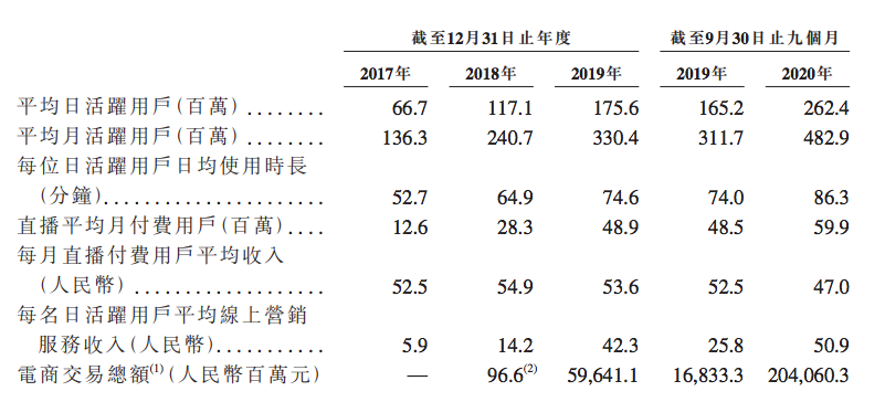 对比快手招股书中发布过的2020年数据,可以发现,截至9月30日,其平均日活从截至6月30日的3.02亿增加到了3.05亿,平均月活则从7.76亿下降到7.69亿。虽然用户体量增长趋缓,用户互动量却再创新高,短视频和直播点赞、转发及评论从1.63万亿增长至2.34万亿,电商交易总额更是从1096亿元猛增至2041亿元。