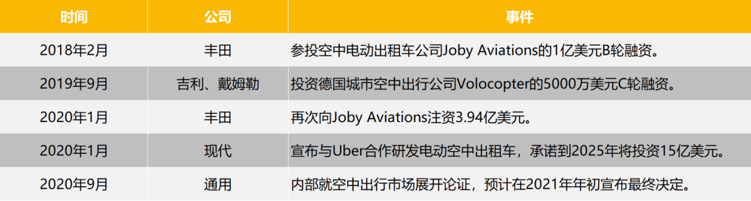 2018年起,丰田、吉利、戴姆勒、现代先后入局,而通用也在商讨空中出行市场的可能性,并权衡是否自行研发飞行汽车。[15]