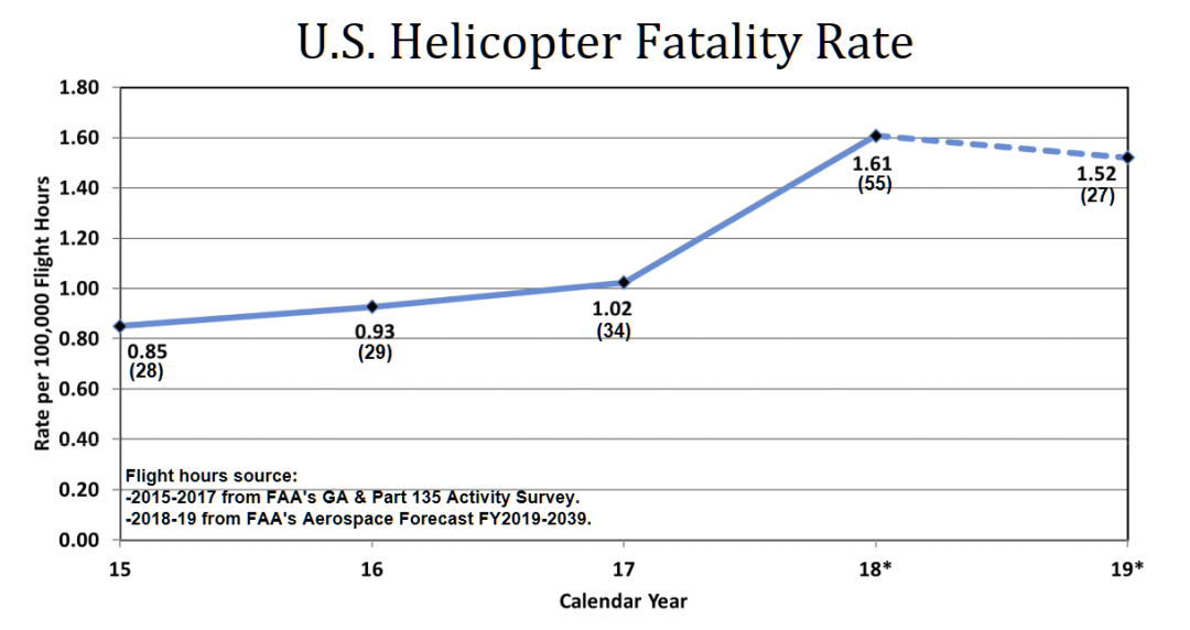 根据美国直升机安全团队(US Helicopter Safety Team)统计,在2019年,直升机飞行的死亡率约为1.52 / 十万小时飞行[9]。直升机事故的前三位则为飞行失控、进入仪表气象条件(即无法通过目视飞行)以及低空飞行。[10]