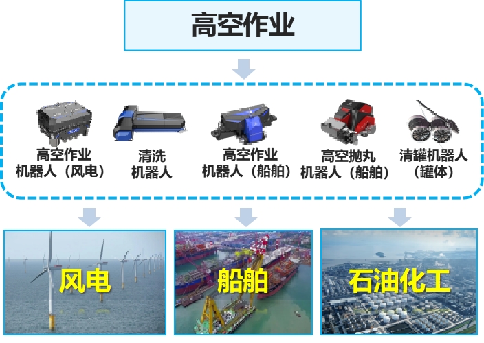 面向危险、繁琐、高强度工种,「量子智能」推出了智能作业类和智能巡检作业类两大产品线。其中,智能作业类产品多用于替代人工在高空、易燃易爆及有毒有害等极端危险环境作业,有效解决风电、造船、化工等行业人员短缺和安全生产的难题。