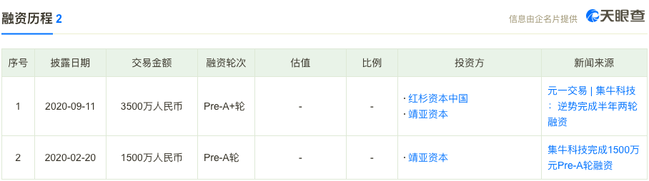 2020年2月,集牛科技完成1500万人民币Pre-A轮融资,投资方为靖亚资本。