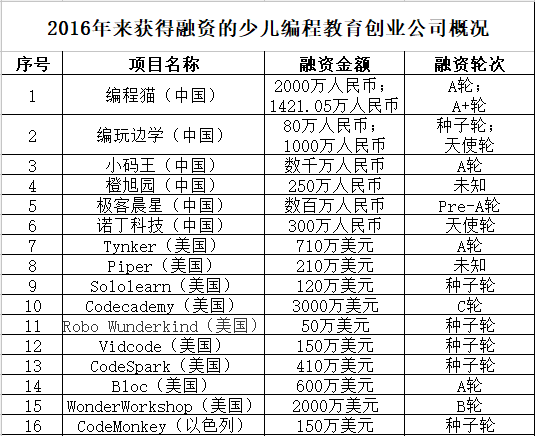 所统计获得融资的少儿编程教育创业公司中,不乏获得千万级人民币甚至千万级美元的创业公司。如,Codecademy获得3000万美元C轮融资,奇幻工房获得2000万美元B轮融资,编程猫获得2000万人民币A轮融资和1421.05万人民币A+轮融资,小码王获得数千万人民币A轮融资。