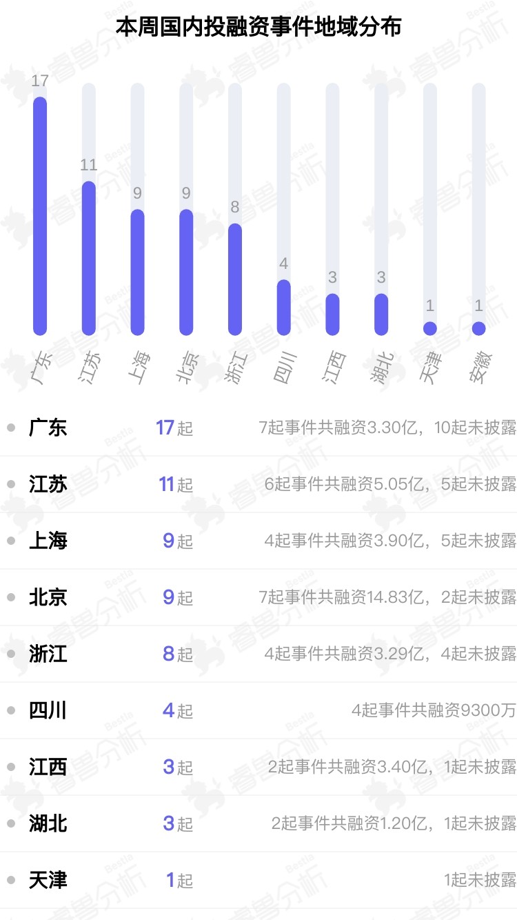 从本周披露获投企业的地域分布来看,主要集中在广东、江苏、上海。其中广东披露17起,江苏披露11起,上海披露9起。