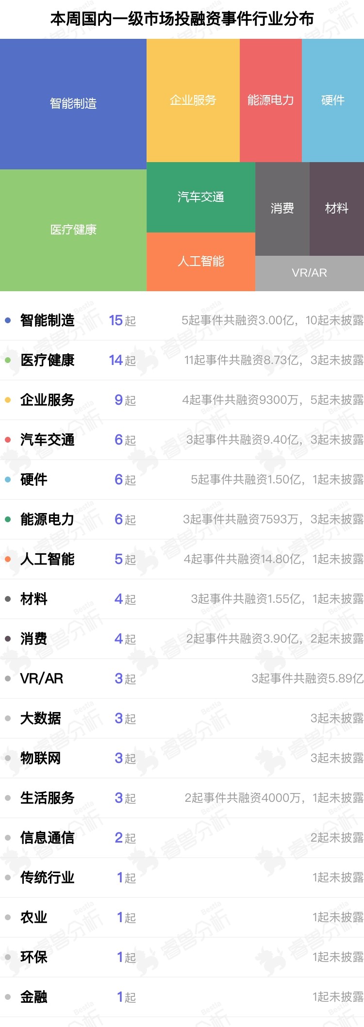 从融资案例数量来看,本周智能制造(15个)、医疗健康(14个)、企业服务(9个)领域融资最活跃。