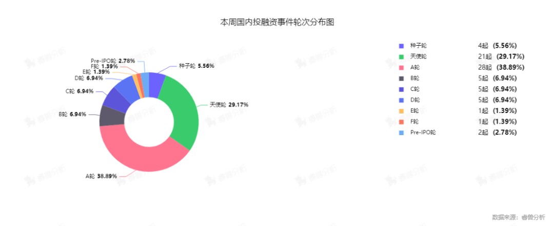 根据睿兽分析监测数据,本周国内一级市场披露的融资事件72起,其中已披露融资金额的事件39起,总规模45.16亿元人民币,平均融资1.16亿元人民币。