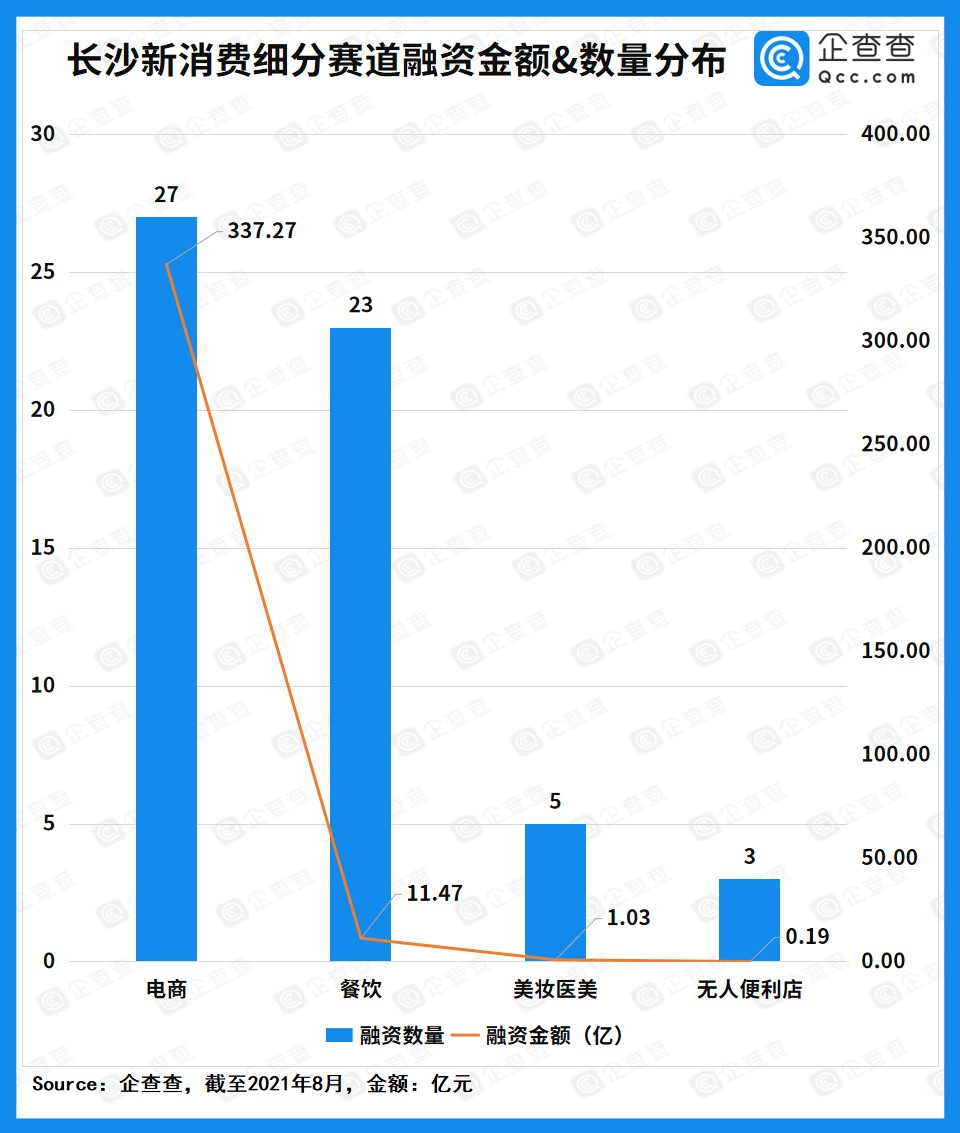 企查查数据研究院将长沙新消费的融资赛道分为“电商、餐饮、美妆医美以及无人便利店”四个细分赛道。其中电商赛道无疑在金额以及融资数量上均占据榜首,共计337.27亿元、27起,“兴盛优选”功不可没,同赛道的“考拉精选”以五千万元融资上榜。除此之外,零食电商“零食很忙”、家居电商“家核优居”、珠宝电商“疯狂鼹鼠”等同样获得不错的融资。