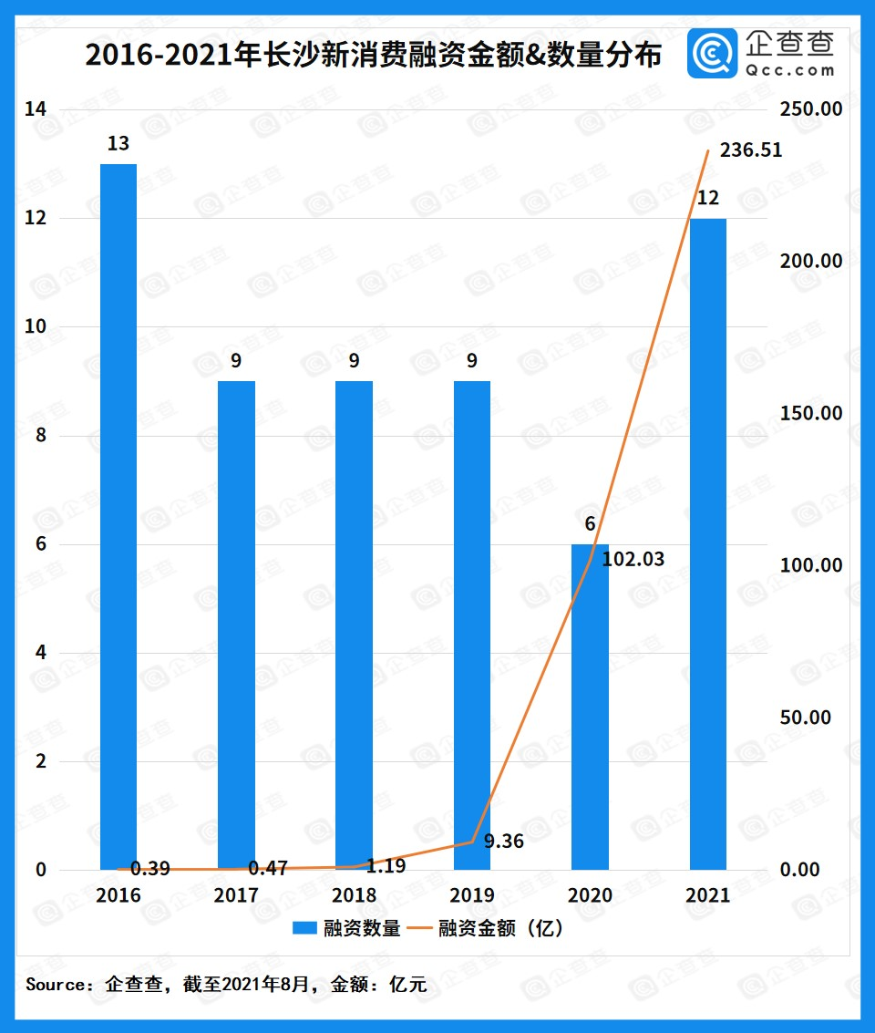 值得注意的是,2021年才过半不久,今年长沙新消费项目的披露融资金额高达236.51亿元,占过去五年来新消费融资总金额的68%,远超2020年全年。