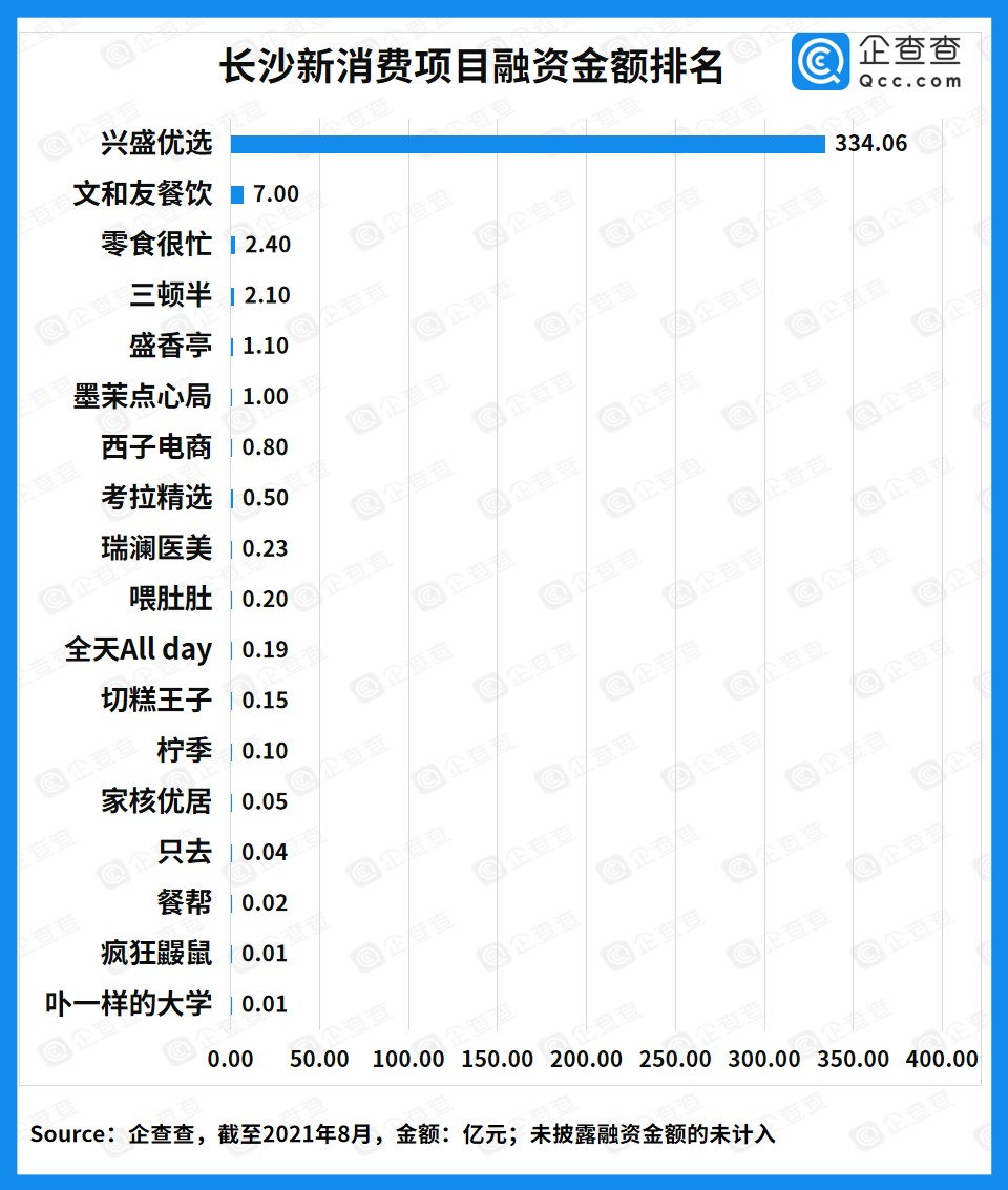 企查查数据显示,从单个项目的融资金额来看,兴盛优选毫无疑问占据榜首,总融资金额超过334.06亿元,投资方中腾讯投资、京东等超级互联网企业赫然在列。此外,文和友餐饮、零食很忙、三顿半以及盛香亭等品牌排在前列。