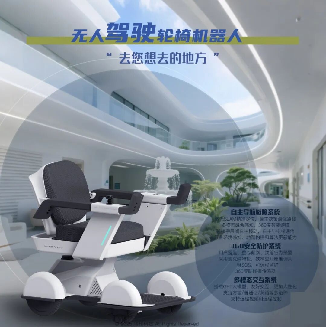智驾轮椅机器人EnviBot:业内率先实现商业化落地的载人无人驾驶机器人,已完成超10万公里安全实测。搭载自研的“灵狐”智能导航避障系统和“方舟”360安全防护系统,具备全自主路径规划、三维避障、环境感知、智能交互等核心功能,有效提升长者的行动自主性和安全性。