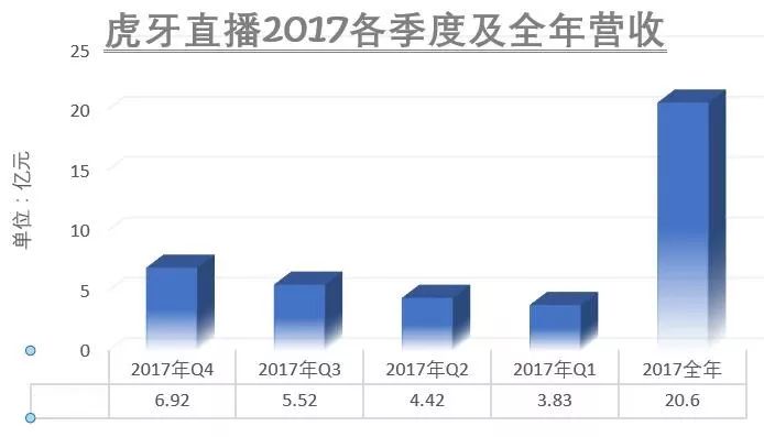 据各季度财报显示,2017年四个季度,虎牙直播的营收分别为3.8亿元、4.4亿元、5.5亿元和6.9亿元,一直处于增长态势。