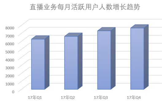 该公司表示,2017年第四季度在YY直播和虎牙的双重推动之下,移动直播业务每月活跃用户人数(MAU)同比增长36.6%至7650万;总视频直播付费用户人数同比增长25.0%至650万人。