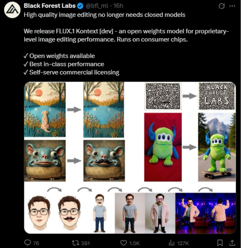 4. Black Forest Labs 宣布开源其最新图像编辑模型 FLUX.1Kontext [dev],专为图像编辑任务设计,以强大的迭代编辑、角色保持和局部与全局精细控制能力为特点,用户通过简单的提示词即可实现图像编辑。(X)