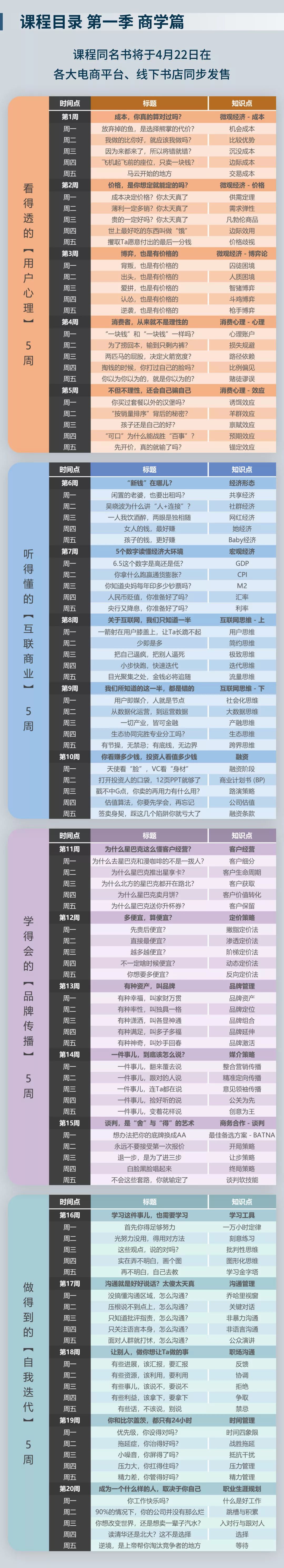于是,他又一次跳出舒适区,从京东离职,靠着多年积攒的资源,召集了一大批在互联网行业摸爬滚打多年的精英,耗费2年时间打磨了一套课程,这套课程就是上面提到的《用得上的商学课》。