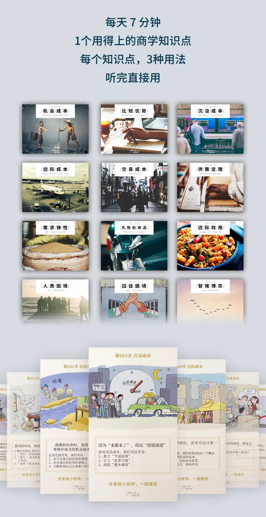● | 课程有100节课,每节课都针对性的讲一个商业知识精华,培养你的商业头脑。 |