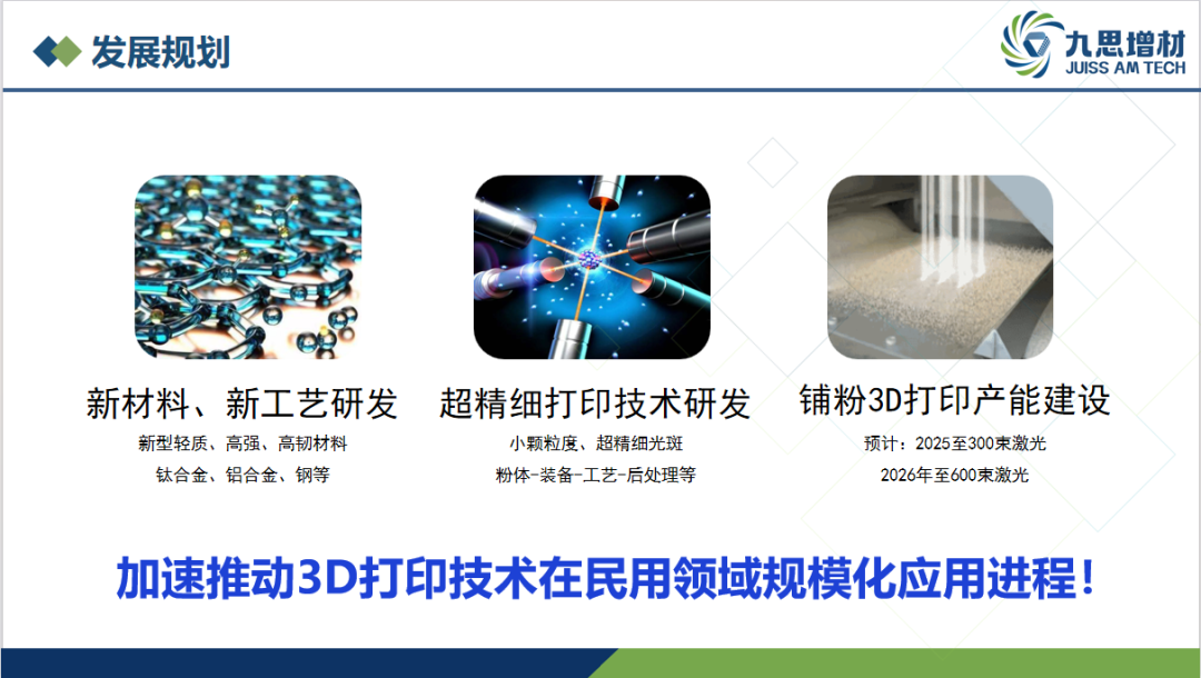 九思增材致力于推动金属3D打印技术在民用领域批量化应用进程!在市场需求的推动下,公司将持续突破3D打印材料性能极限及结构精细度壁垒,提高金属3D打印定制化产品性能和批产能力,实现可对标传统工艺的3D打印批量制造产能及成本边际,满足未来消费电子及高端精密等下游领域持续增长的应用需求。