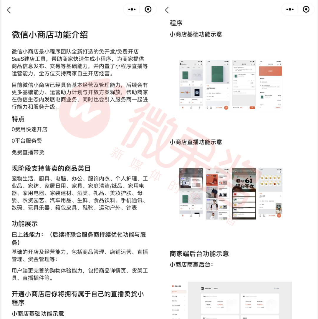 根据《微信小商店开店须知》中介绍,微信小商店是小程序团队打造的SaaS建店工具,帮助商家快速生成小程序,目前已上线功能包括:
