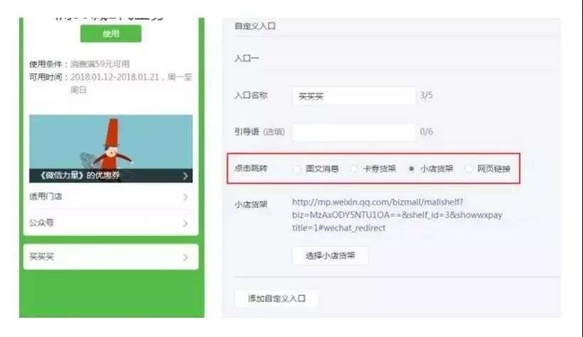 在「门店小程序」的发券下方,可以设置多个入口,用户点击可跳转,包括: