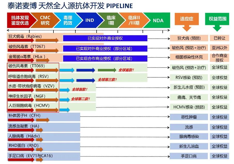 目前,泰诺麦博自主研发的破伤风毒素单抗药物TNM002已于2020年11月在澳洲启动I期临床试验,在美国的临床试验申请近期也已获得FDA批准,TNM002是全球首款抗破伤风毒素全人源单抗进入人体试验。作为利用基因重组技术工业化生产的新一代单克隆抗体药物,TNM002具有中和能力强、安全性好、产量高等优点。TNM002上市后有望大面积取代现有的“人破”和“马破” ,预估在国内每年将会有数十亿元的市场份额,而在全球范围内市场份额将高达百亿元。