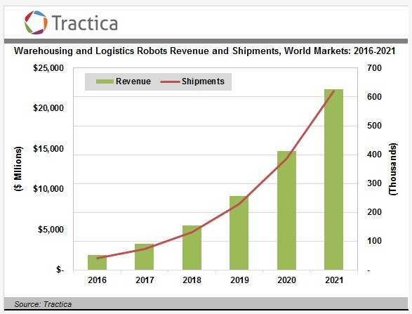 Tractica预测,到2021年全球仓储和物流机器人出货量将从2016年的4万台激增至62万部。同时,该行业的市场收入将从2016年的19亿美元增长至224亿美元。