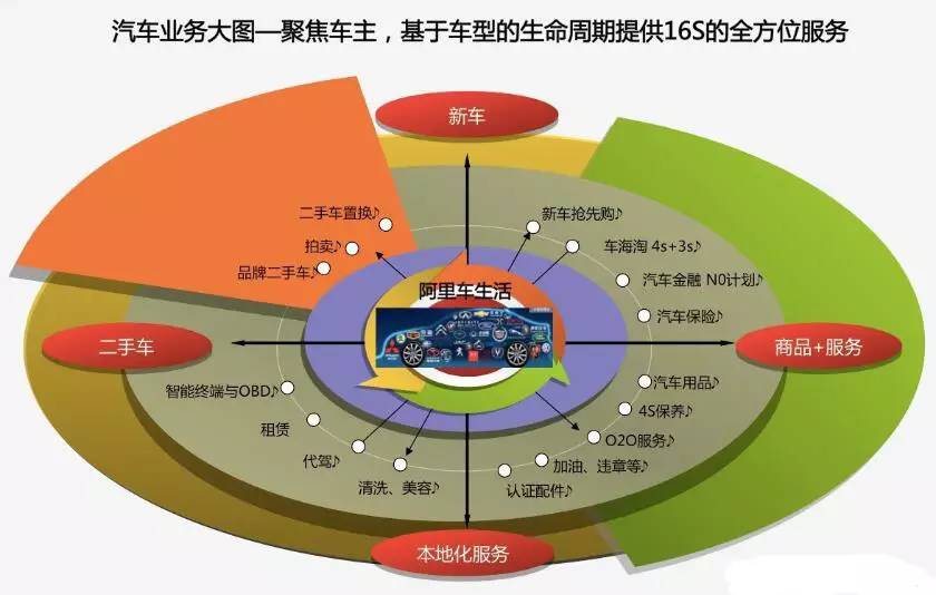 下图为阿里的汽车业务版图,围绕着车生活,阿里“互联网+汽车”涉及新车、二手车、商品服务、本地化服务等各个层面。