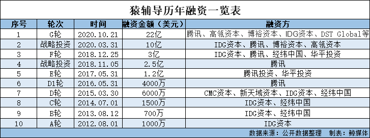 此轮融资过后,猿辅导已累计进行了10轮融资,融资总金额达38.02亿美元。此轮22 亿美元的融资是教育行业迄今为止融资额最大的一笔,而猿辅导也将继续领衔教育行业未上市公司中估值最高的“独角兽”。