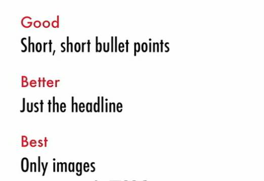 短,简短的要点,其实更好的是没有要点,给我标题就好了。但是你知道吗?Steve Jobs用多少的要点或者是标题?基本没有。那么你该怎么办?最棒的办法是用图片,一个简单的图片,我看一眼图片,觉得百闻不如一见,你看一眼图片,看完后,清理思绪,转回来注意到我,你专注在我身上,想为什么我是个很棒的人,为什么你要给我投资,和为什么这个投资项目很合理。
